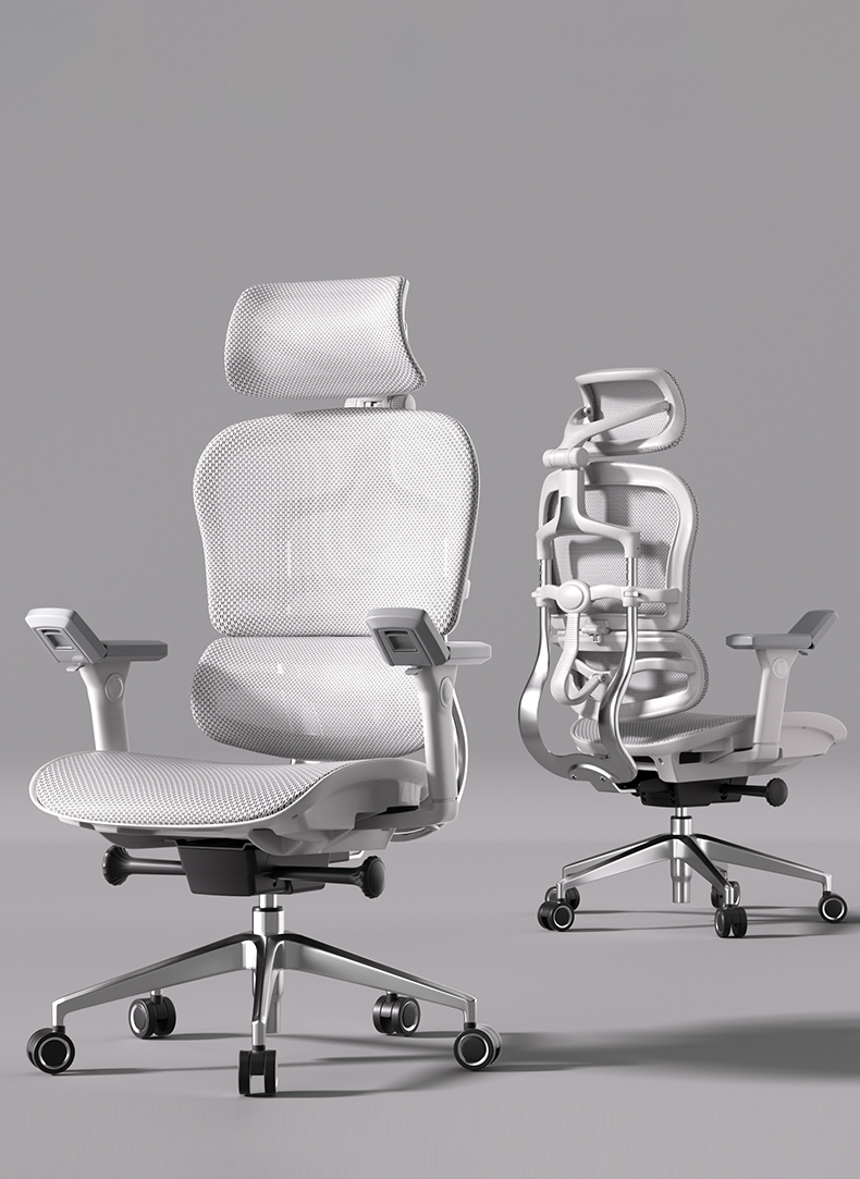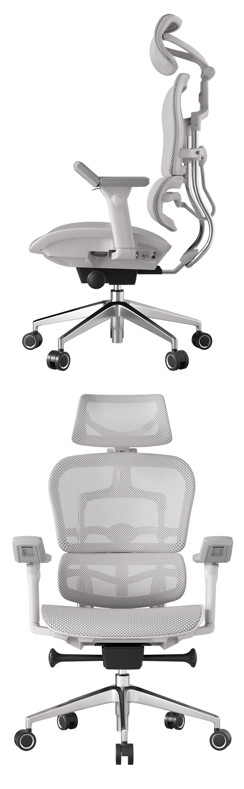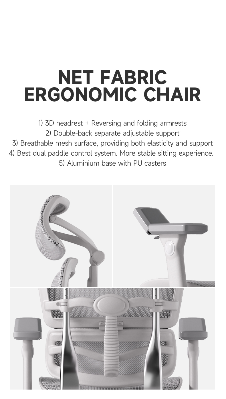 1) 3D headrest + Reversing and folding armrests 2) Double-back separate adjustable support 3) Breathable mesh surface, providing both elasticity and support 4) Best dual paddle control system. More stable sitting experience. 5) Aluminium base with PU casters