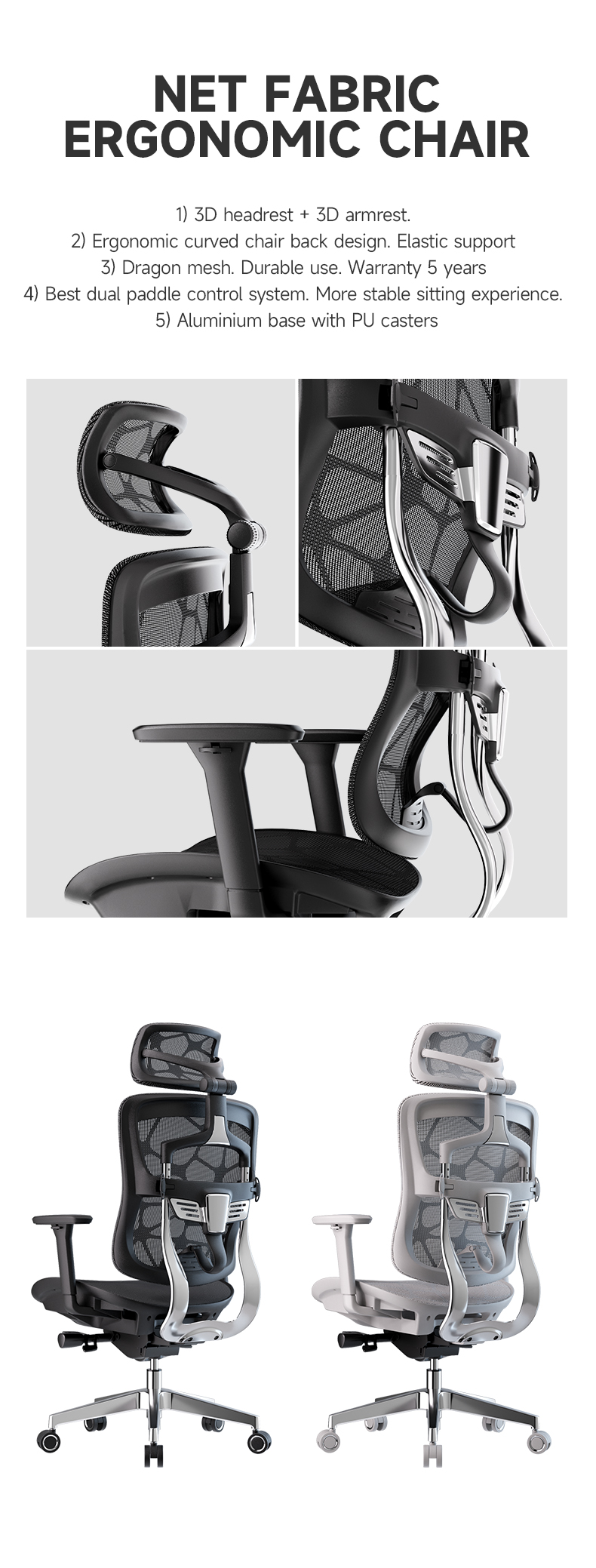 1) 3D headrest + 3D armrest. 2) Ergonomic curved chair back design. Elastic support 3) Dragon mesh. Durable use. Warranty 5 years 4) Best dual paddle control system. More stable sitting experience. 5) Aluminium base with PU casters