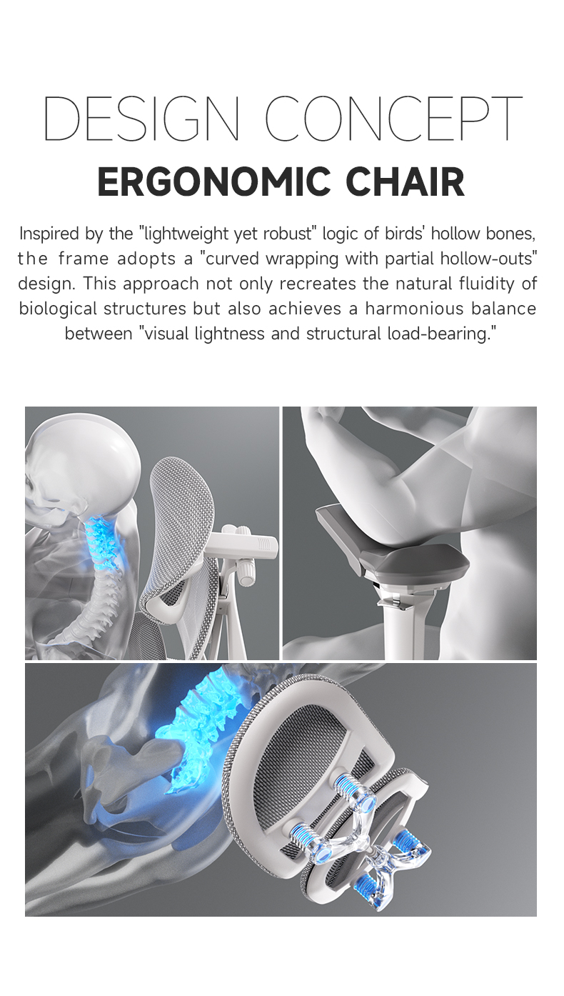 Inspired by the "lightweight yet robust" logic of birds' hollow bones, the frame adopts a "curved wrapping with partial hollow-outs" design. This approach not only recreates the natural fluidity of biological structures but also achieves a harmonious balance between "visual lightness and structural load-bearing."